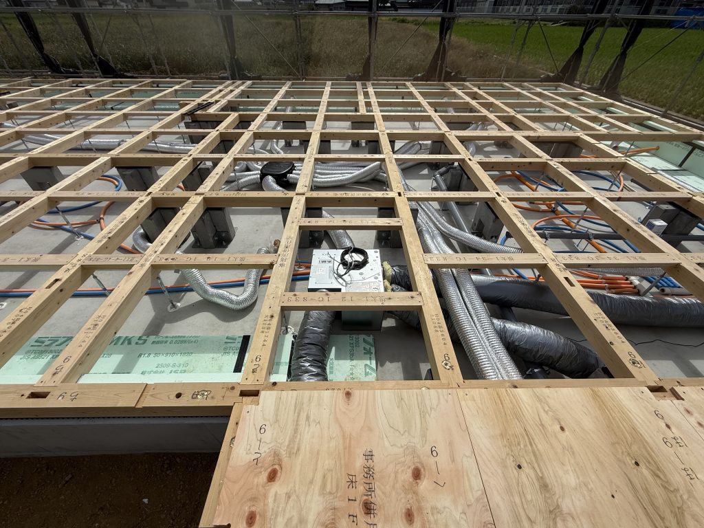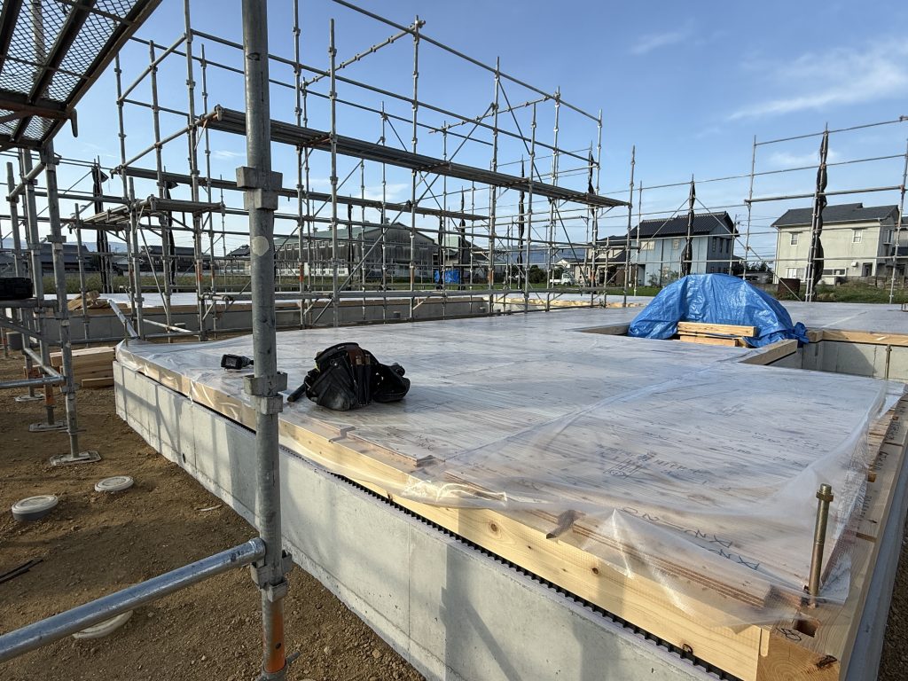 土台が整うと、床合板を張り、上棟へ向けた準備が進んでいきます。