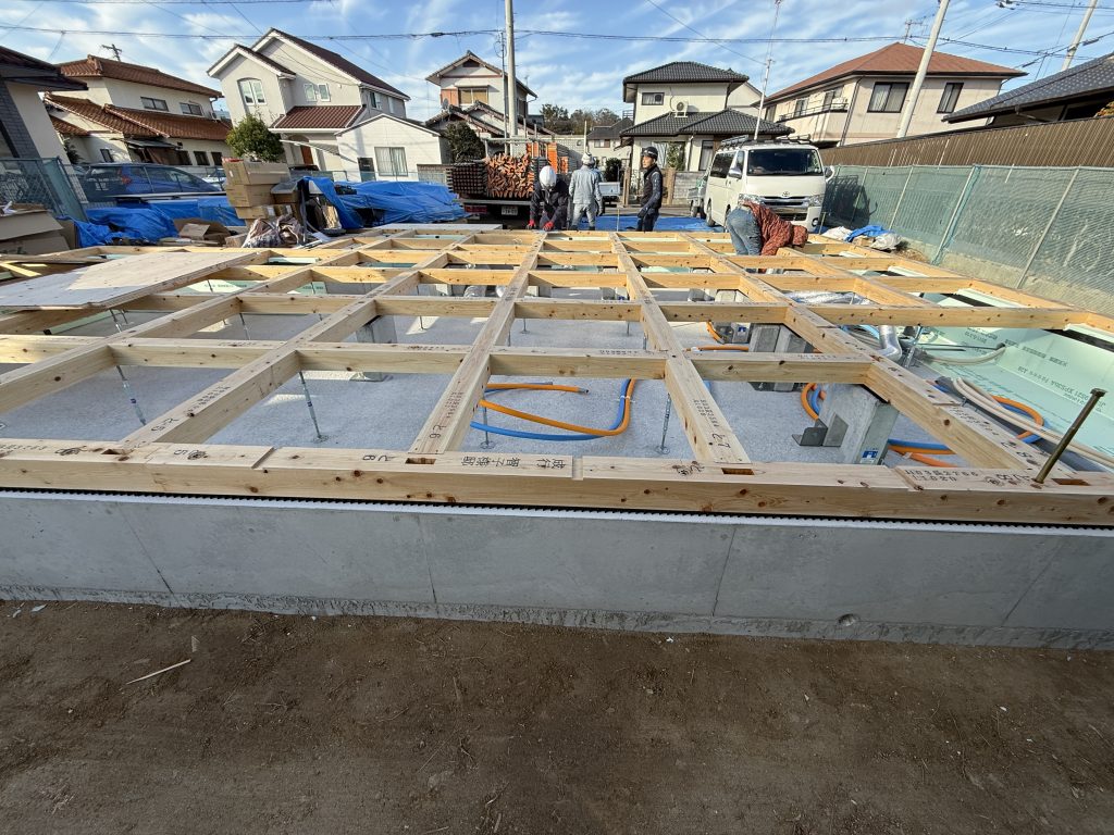 土台が整うと、床合板を張り、上棟へ向けた準備が進んでいきます。